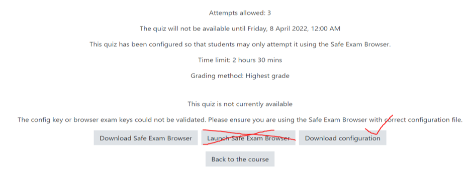 - Do NOT use the “Launch Safe Exam Browser”. Only access the quiz by downloading and running the configuration.